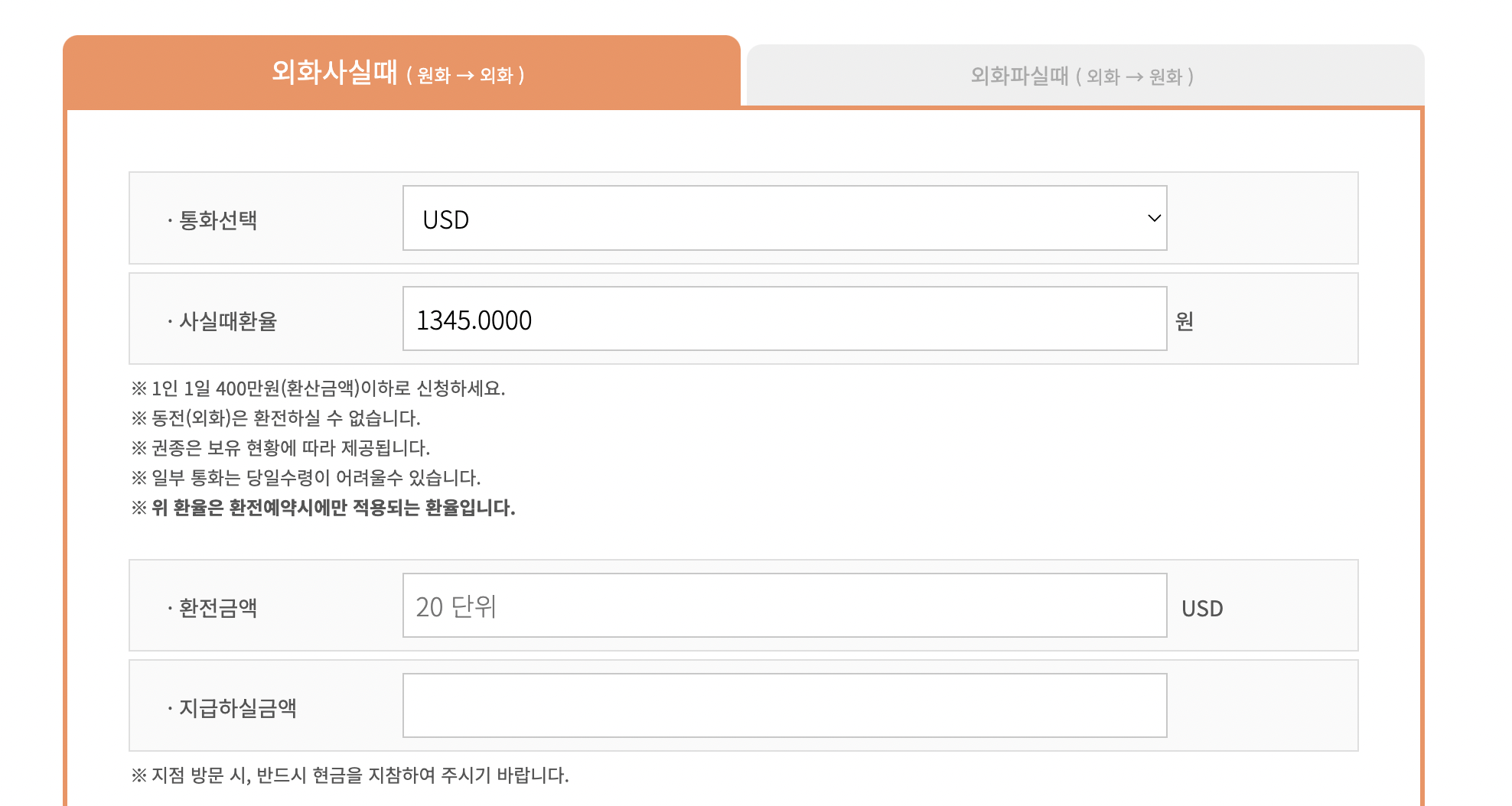 | 단점 | - 은행 대기시간 있을 수 있음 - 수수료 높은 편 - 달러, 엔화, 유로 외 기타 외화 없을 수 있음 |