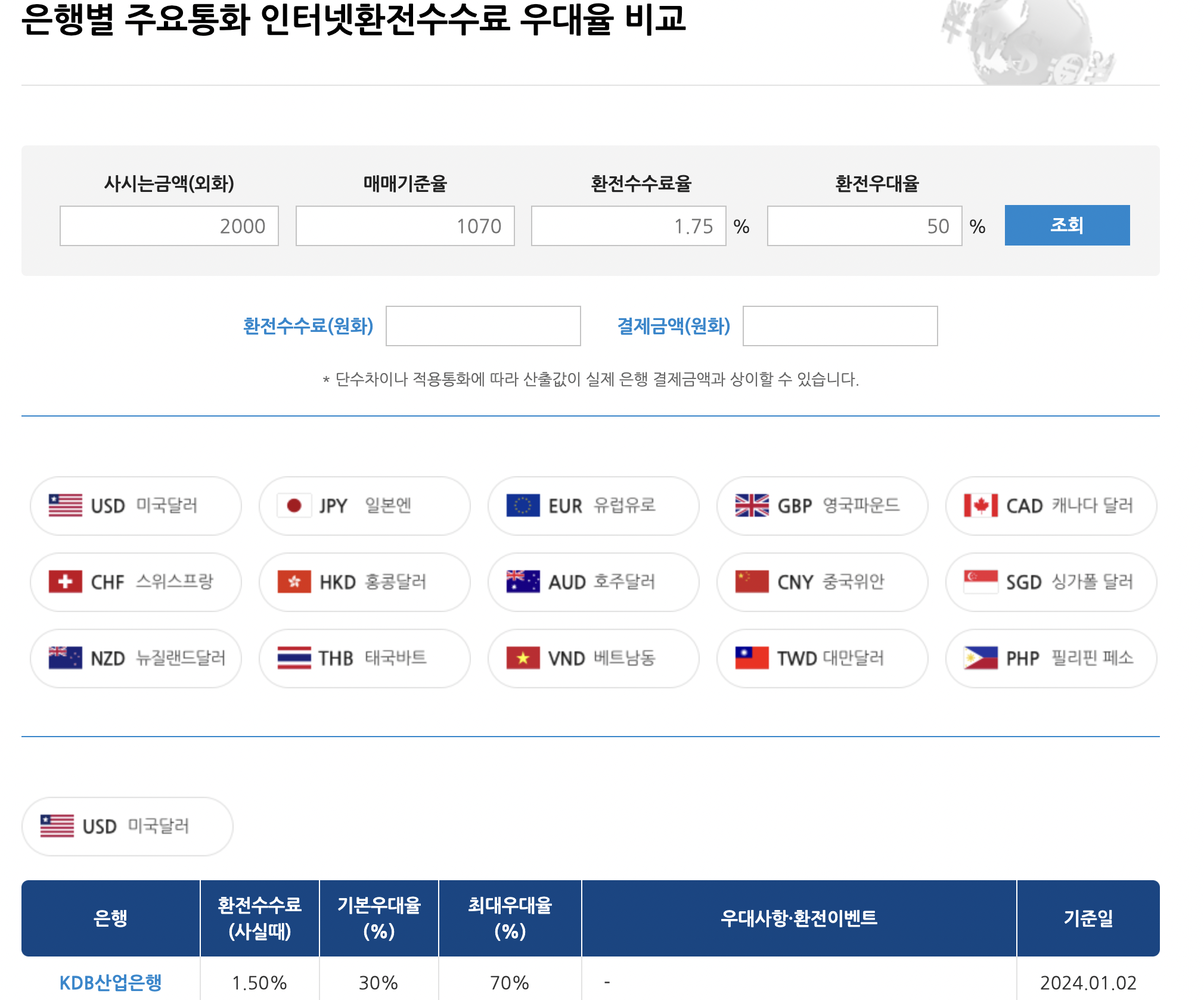 또한 '은행연합회 외환길잡이'라는 홈페이지에서 은행별 주요통화 환전 수수료를 비교할 수 있게 해두었기 때문에 확인한 뒤 가장 저렴한 은행을 이용하는 것도 방법입니다. 이 글에서 소개하는 모든 페이지는 상단의 버튼을 통해 확인할 수 있습니다.