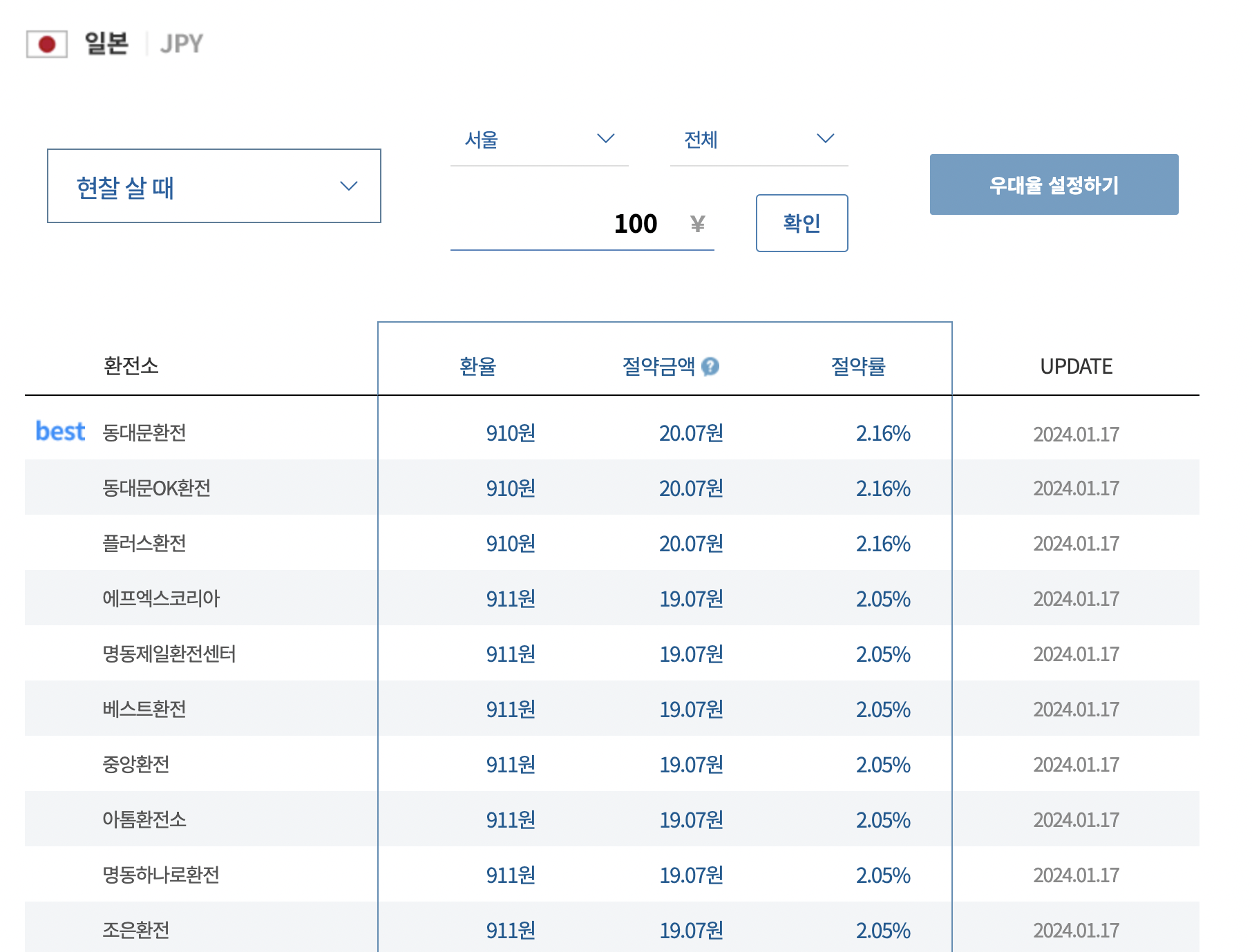 환전을 싸게 하기 위해서는 환율과 수수료가 가장 저렴한 때에 해두는 것이 포인트인데요. 환전소라는 것이 엄청 많은 것은 아니기 때문에 몇 몇 사이트를 비교한 뒤 저렴한 곳을 찾을 수 있습니다.